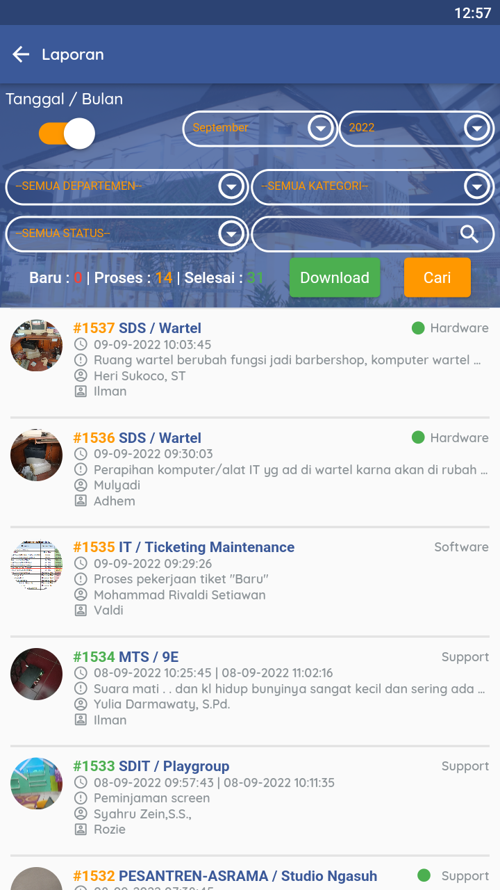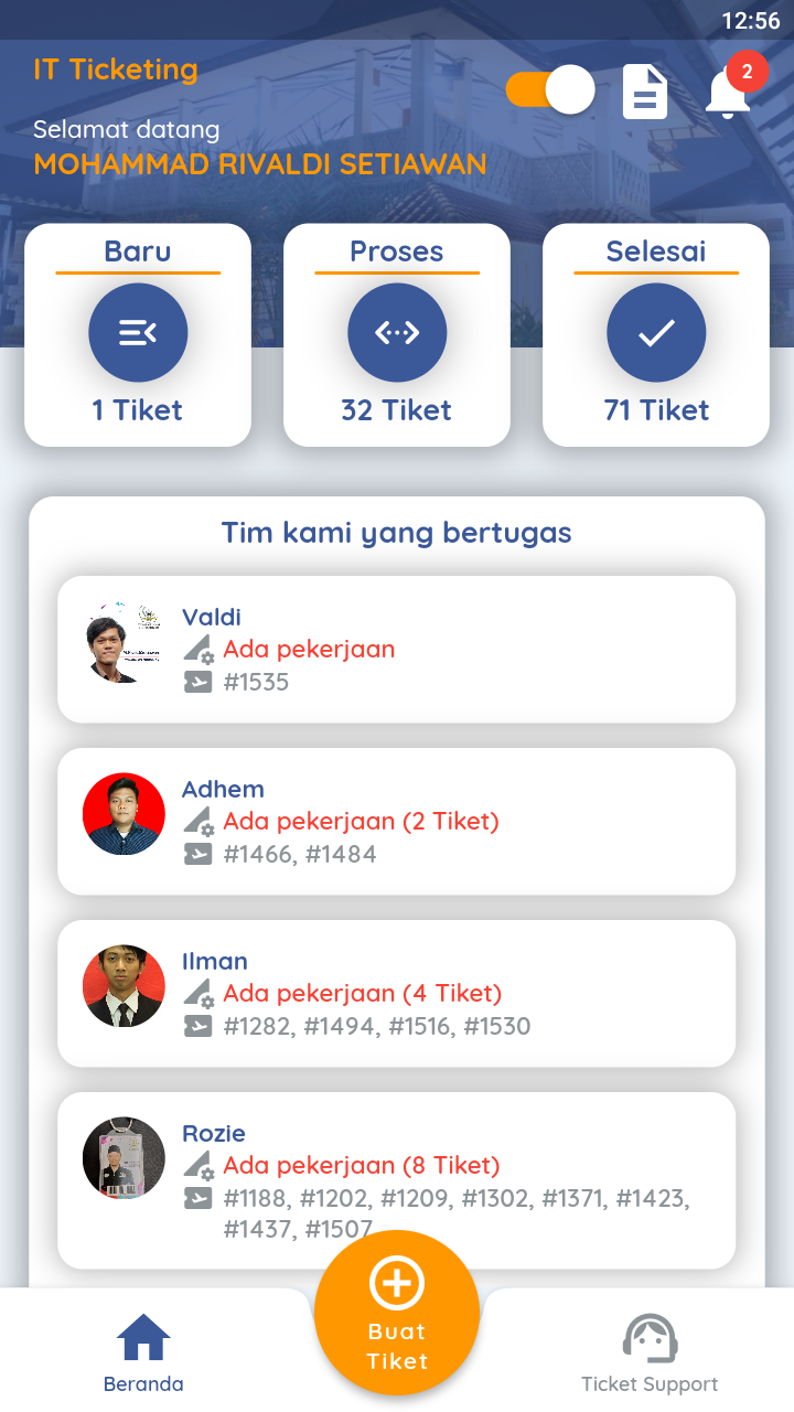 Ticket support for IT, Mechanical and Electrical (ME), Cleaning Service Officer (CSO), Civil & Markprom services.